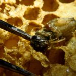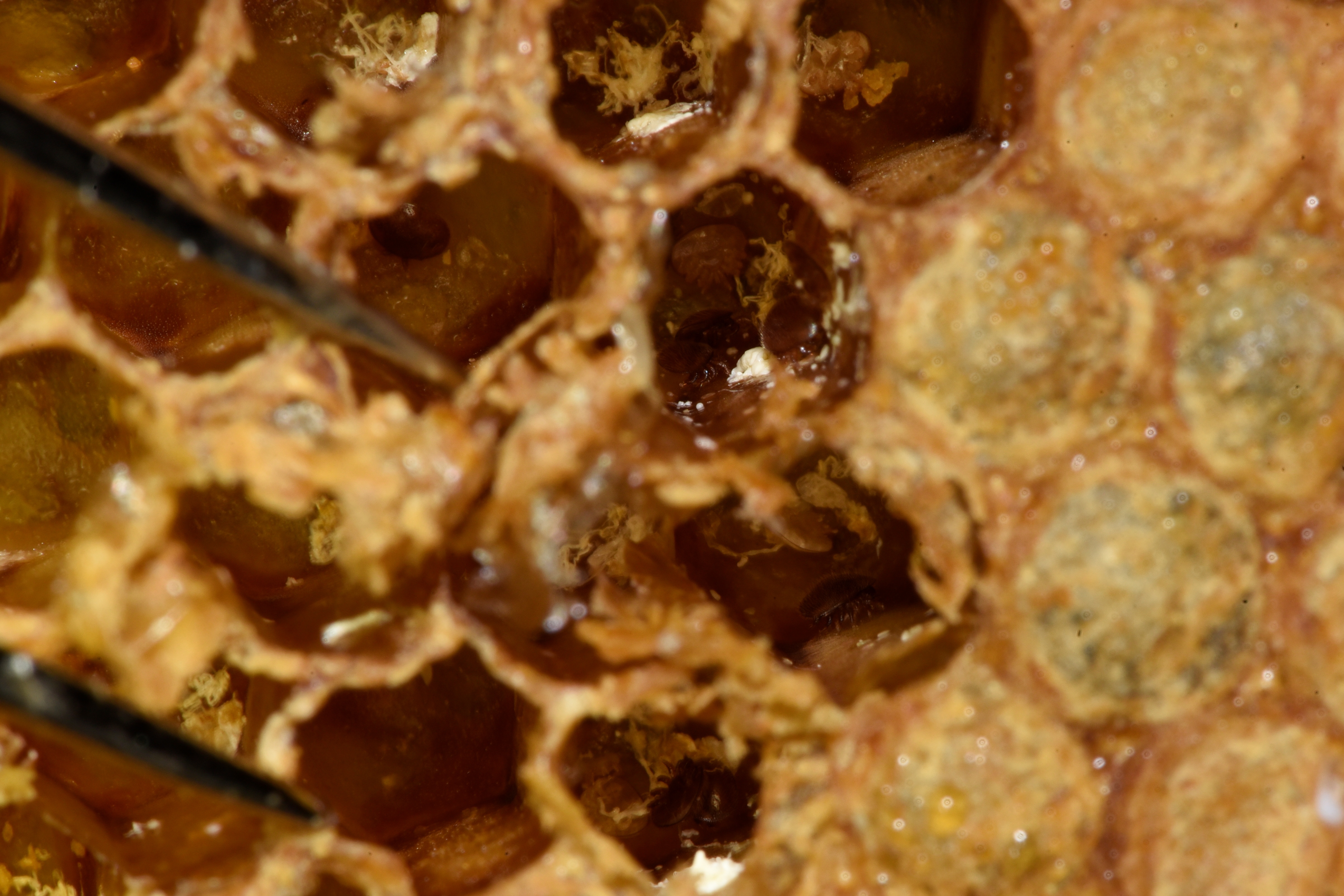Wir ergänzten unser Wissen über das Auszählen der Varroamilben mit Fotografien, bei denen Jürgen Brausse über die Schulter geschaut wurde. Dann öffneten wir jeweils hundert Zellen und zählten die adulten Milben, die sich nicht vermehrt hatten, sowie diejenigen, die sich vermehrt hatten.