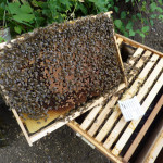 Anfang bis Mitte Juli werden alle Königinnen in den Brutstopp-Käfig eingesperrt. Dem Käfig wird kein Futter beigegeben, die Bienen sollen die Königin weiter pflegen. Reifer Honig wird abgeerntet und die vollen durch leere Honigwaben ersetzt. Das ist wichtig, damit die Bienen bei Tracht nicht die zunehmend leerer werdenden Brutwaben verhonigen. Das Volk braucht genug Platz.